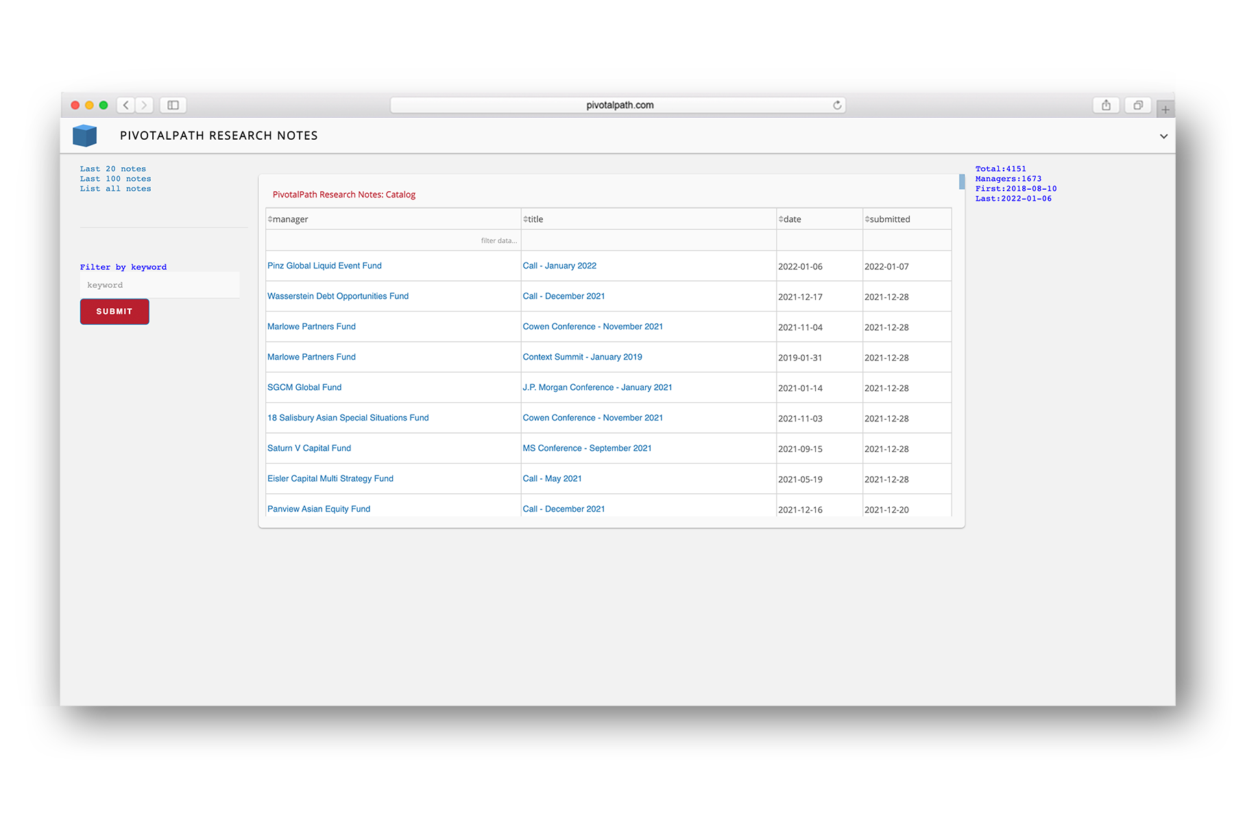 Research across 2,500+ institutionally relevant hedge funds, meaningful indices, 4,000+ manager meeting notes and customizable analytics to put it all together.